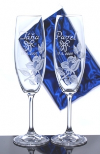 např. šampaň flétny ozdobíme pískováním datem Vaší svatby, místem svatby